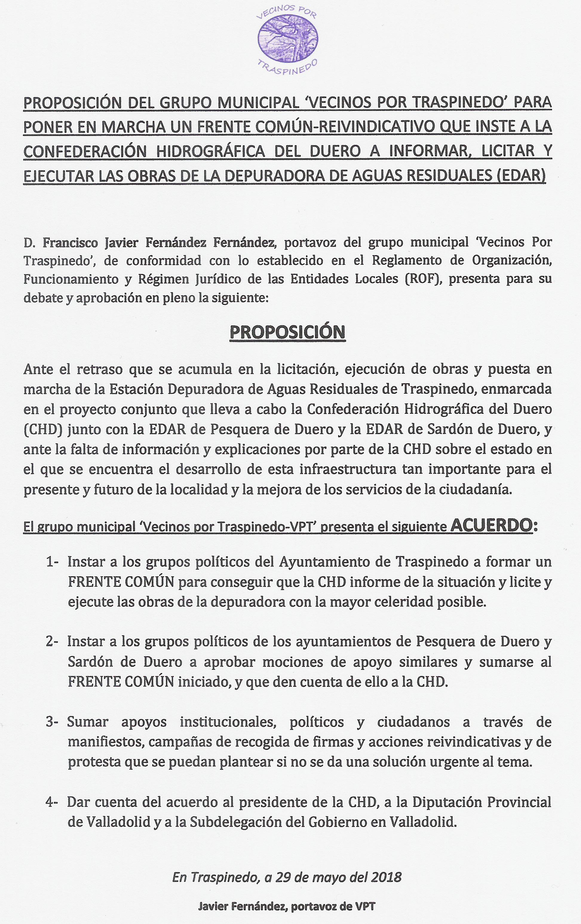 PROPOSICIÓN DEL GRUPO MUNICIPAL ‘VECINOS POR TRASPINEDO’ PARA PONER EN MARCHA UN FRENTE COMÚN-REIVINDICATIVO QUE INSTE A LA CONFEDERACIÓN HIDROGRÁFICA DEL DUERO A INFORMAR, LICITAR Y EJECUTAR LAS OBRAS DE LA DEPURADORA DE AGUAS RESIDUALES (EDAR)
