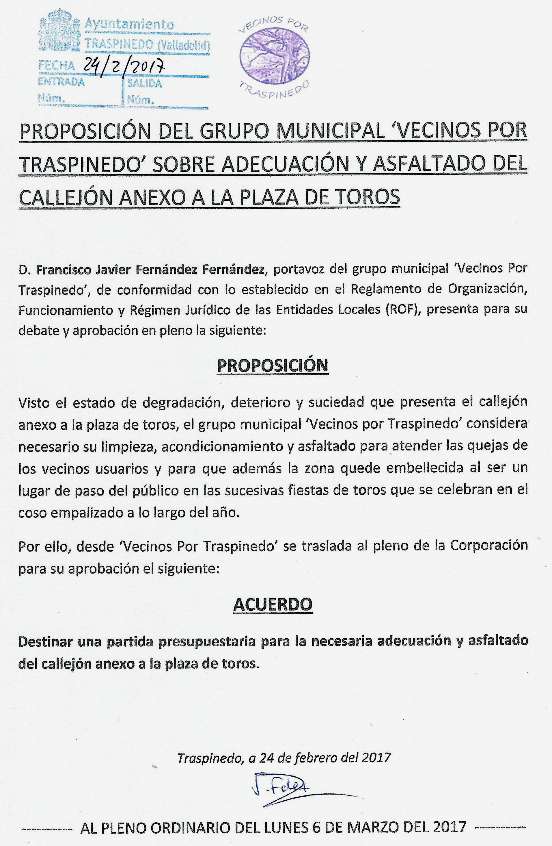 PROPOSICIÓN DEL GRUPO MUNICIPAL ‘VECINOS POR TRASPINEDO’ SOBRE ADECUACIÓN Y ASFALTADO DEL CALLEJÓN ANEXO A LA PLAZA DE TOROS