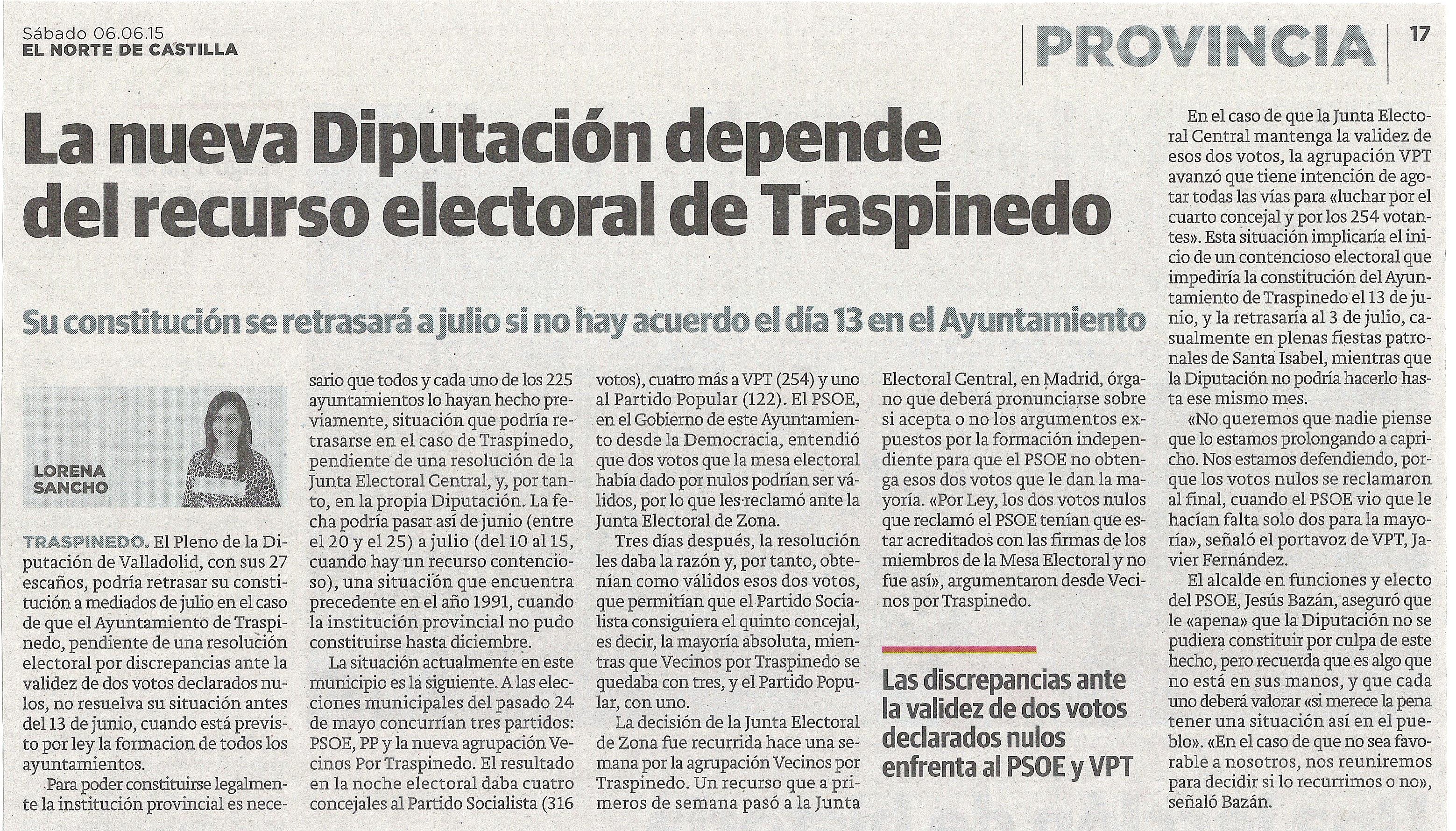 La nueva Diputación depende del recurso electoral de Traspinedo (El Norte de Castilla, 06-06-2015) junio 6, 2015 | No hay comentarios VPT en los medios