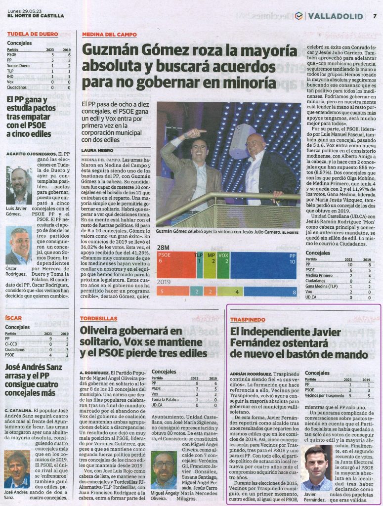 El independiente Javier Fernández ostentará de nuevo el bastón de mando (El Norte de Castilla, 29-05-2023)