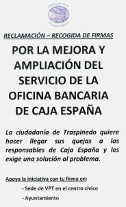 Reclamación por la mejora y ampliación del servicio de la oficina bancaria de Caja España noviembre 10, 2015 | No hay comentarios | Reclamaciones e iniciativas Read More »