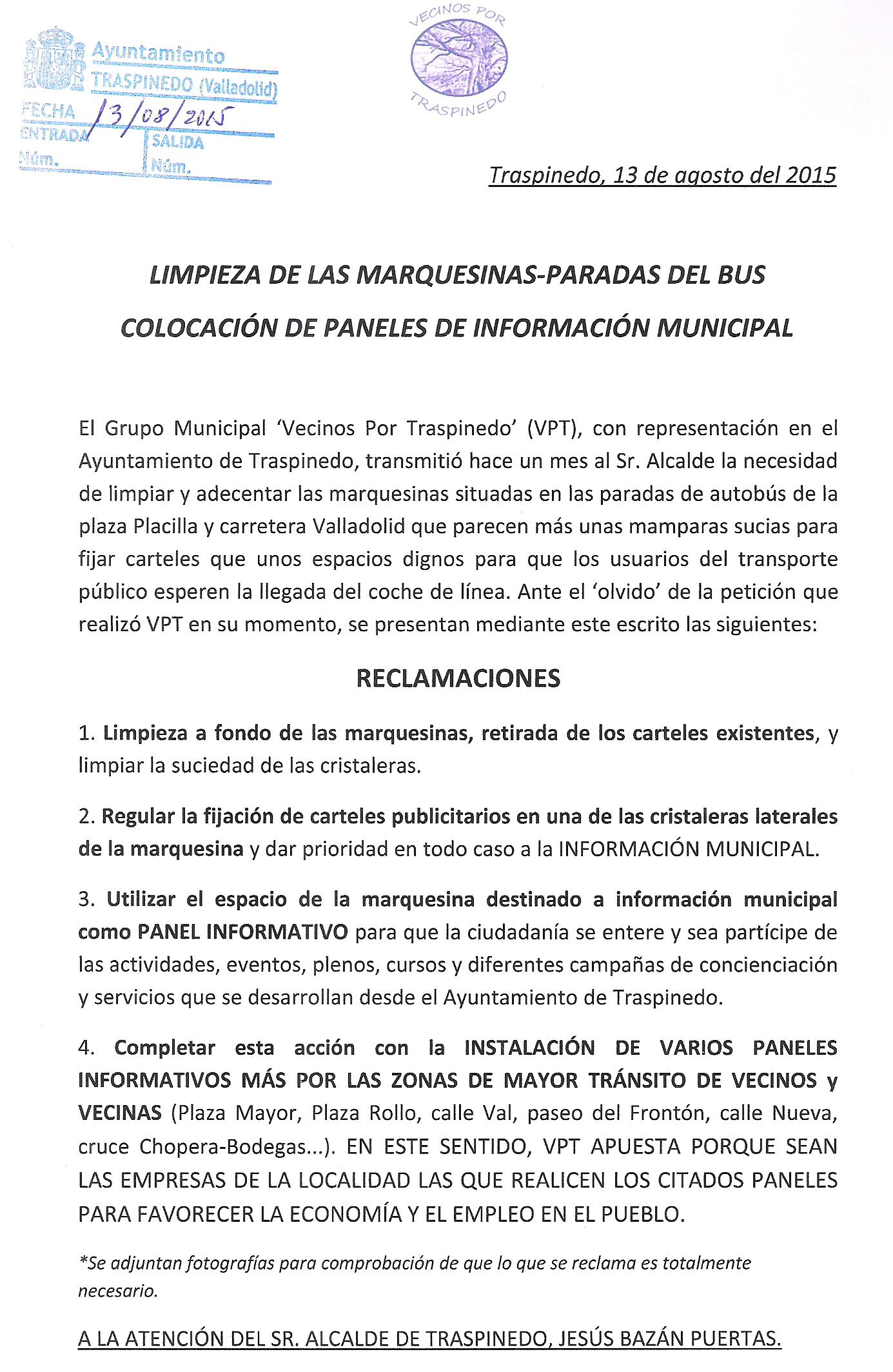 LIMPIEZA DE LAS MARQUESINAS-PARADAS DEL BUS y COLOCACIÓN DE PANELES DE INFORMACIÓN MUNICIPAL agosto 13, 2015 | No hay comentarios Reclamaciones e iniciativas