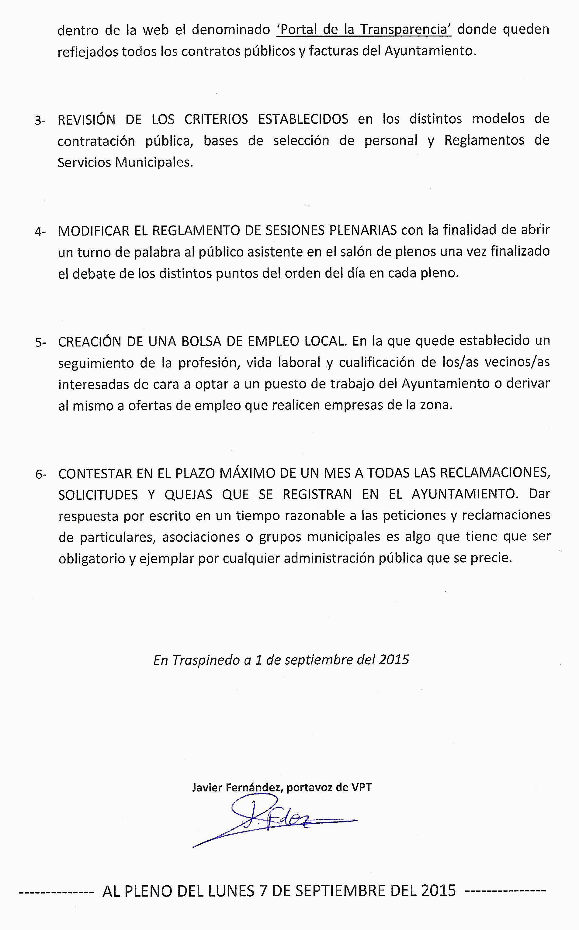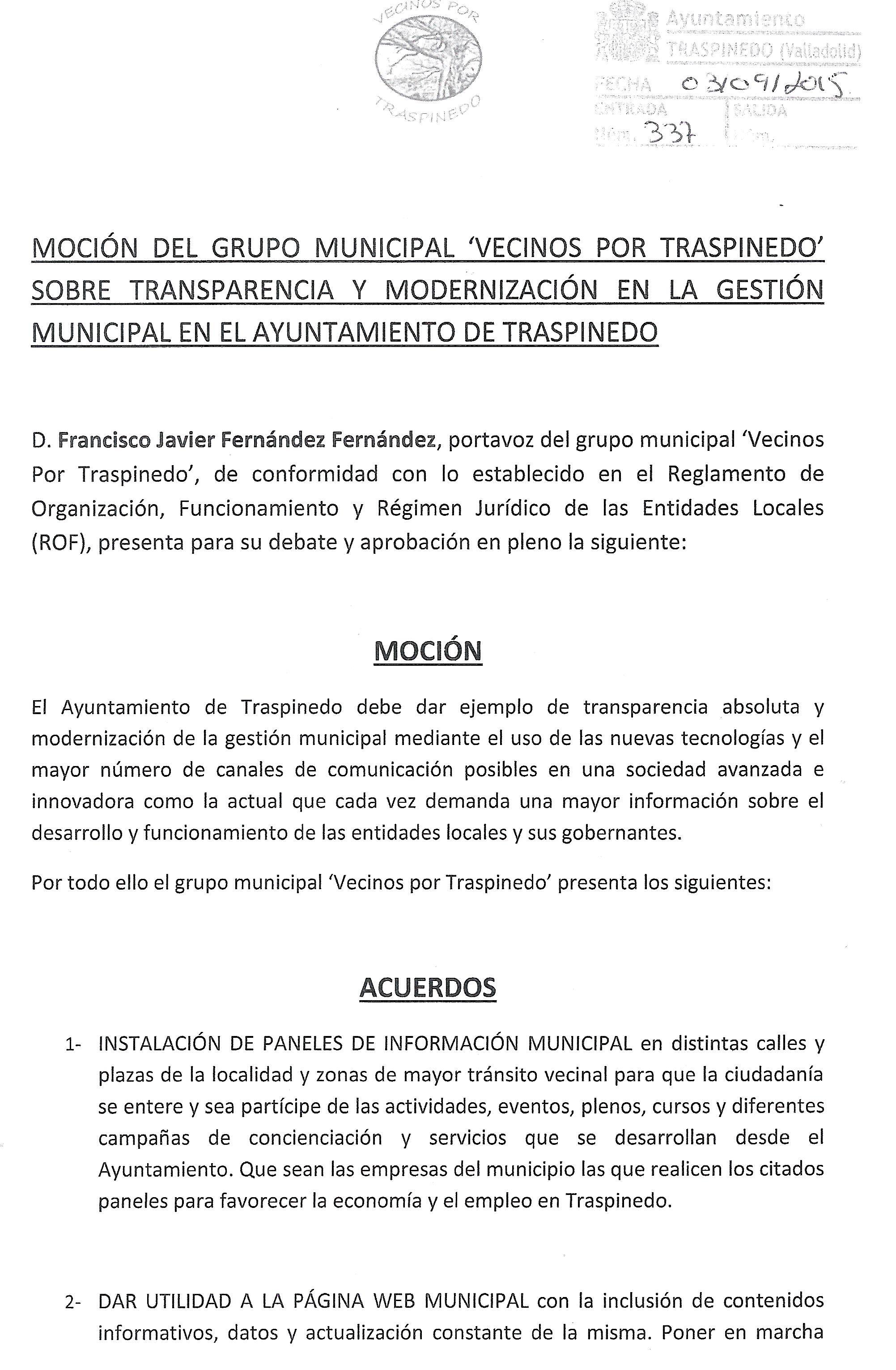 PROPOSICIÓN DEL GRUPO MUNICIPAL ‘VECINOS POR TRASPINEDO’ SOBRE TRANSPARENCIA Y MODERNIZACIÓN EN LA GESTIÓN MUNICIPAL EN EL AYUNTAMIENTO DE TRASPINEDO septiembre 7, 2015 | No hay comentarios PROPUESTA ACEPTADA PARA SU DEBATE Y ESTUDIO. Año 2015