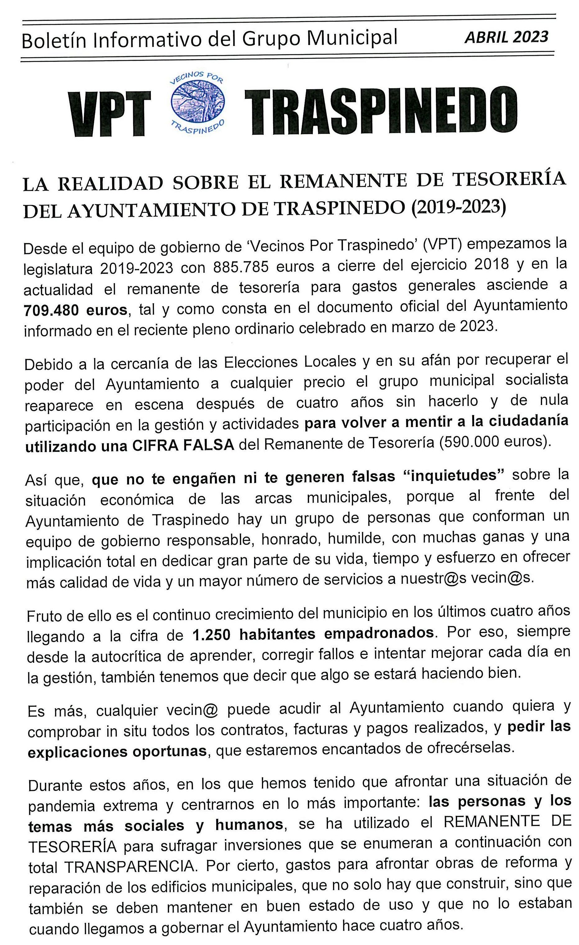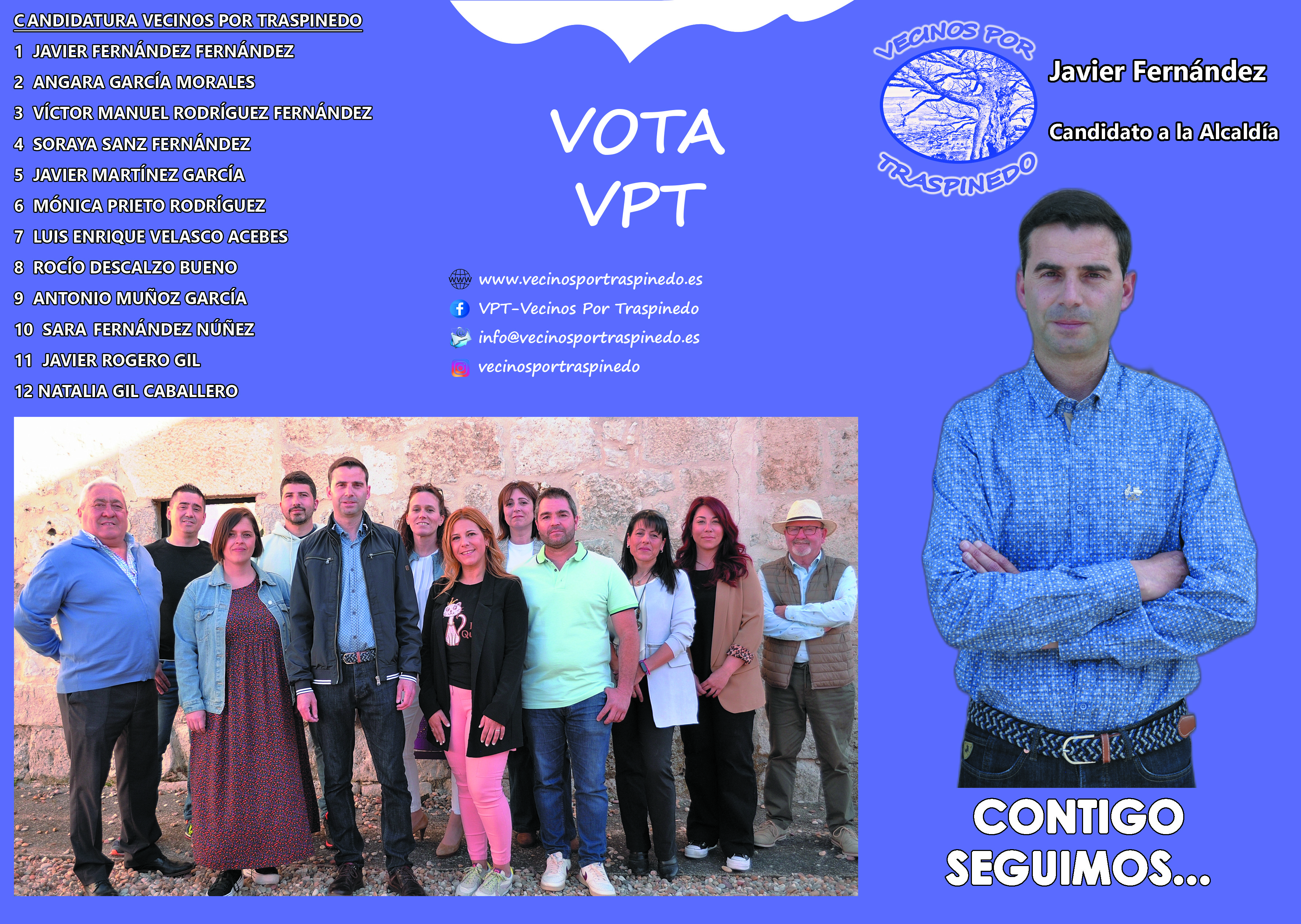 CANDIDATURA VECINOS POR TRASPINEDO (VPT) – CONTIGO SEGUIMOS… Con avalada experiencia en la gestión municipal como equipo de gobierno durante estos cuatro años donde nos hemos tenido que enfrentar a situaciones extremas, sabiendo estar a la altura de las circunstancias, y con incorporaciones que aportan preparación, compromiso y nuevas ideas conformamos un equipo de personas […]