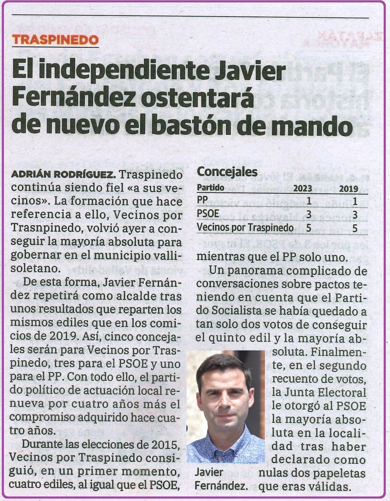 El independiente Javier Fernández ostentará de nuevo el bastón de mando (El Norte de Castilla, 29-05-2023)
