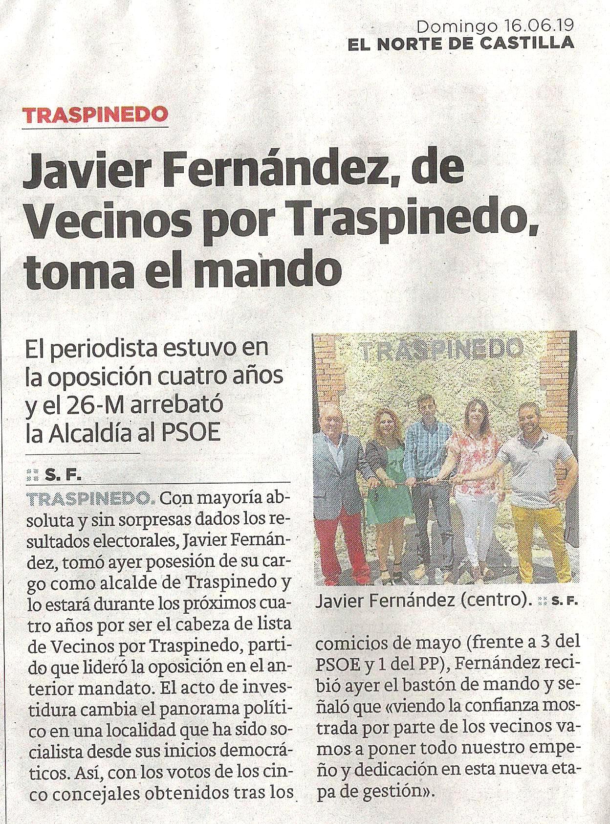 Javier Fernández, de Vecinos Por Traspinedo toma el mando (El Norte de Castilla 16-06-2019)