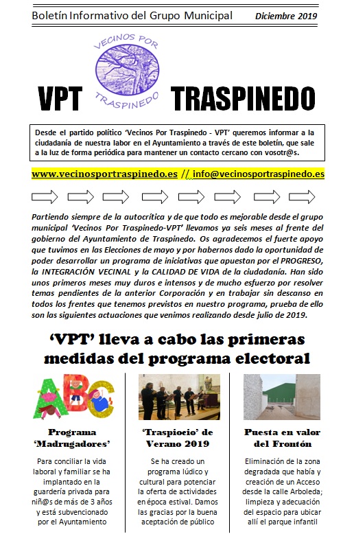 Muchísimas gracias Traspinedo por el fuerte apoyo vecinal que hemos recibido en las urnas el 26 de mayo y por la opción de cambio en la gestión del Ayuntamiento que habéis elegido como mayoritaria: Vecinos Por Traspinedo (VPT). Tras cuatro años de duro e intenso trabajo en la Oposición que la gente ha valorado y […]
