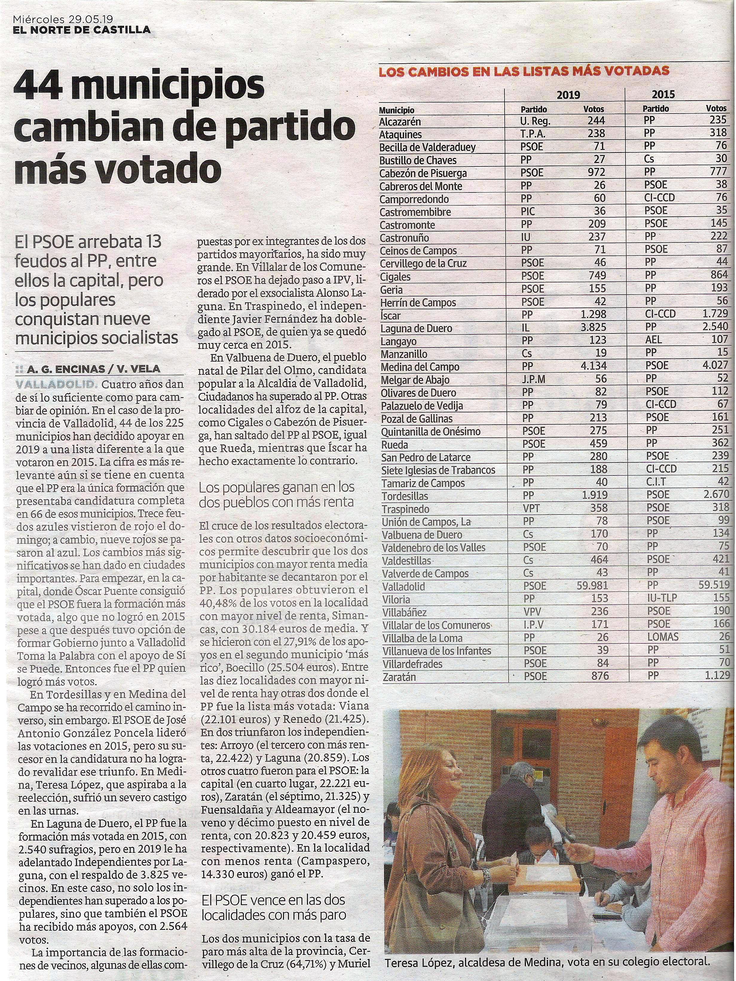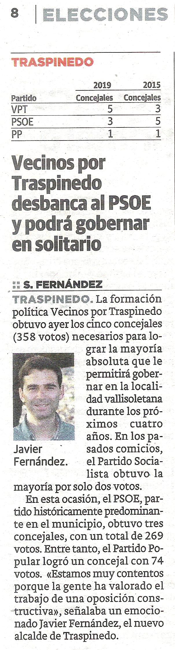Vecinos Por Traspinedo desbanca al PSOE y podrá gobernar en solitario (El Norte de Castilla 27-05-2019)