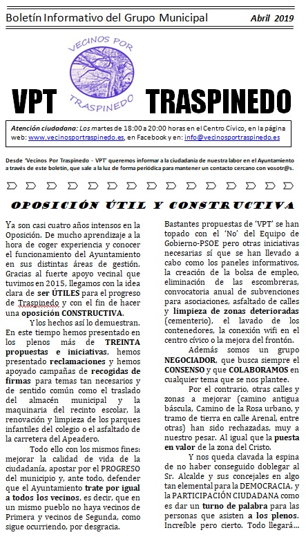 Como ya sabéis desde Vecinos Por Traspinedo-VPT volvemos a presentar candidatura a las Elecciones Locales del próximo 26 de mayo para intentar dar un cambio de rumbo al Ayuntamiento, que falta hace. CANDIDATURA VECINOS POR TRASPINEDO (VPT) JAVIER FERNÁNDEZ FERNÁNDEZ ANGARA GARCÍA MORALES VÍCTOR MANUEL RODRÍGUEZ FERNÁNDEZ JAVIER MARTÍNEZ GARCÍA […]