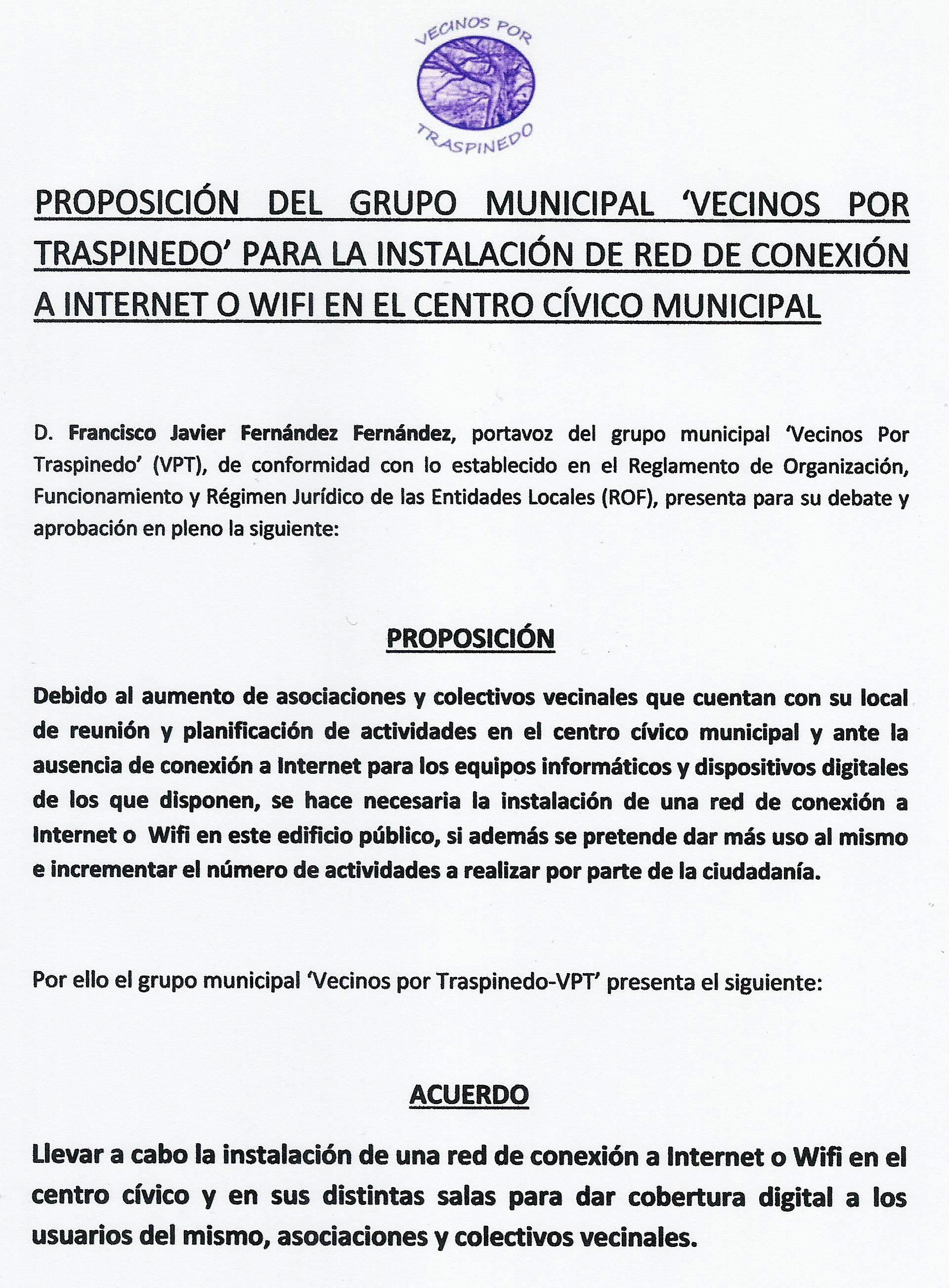 PROPOSICIÓN DEL GRUPO MUNICIPAL ‘VECINOS POR TRASPINEDO’ PARA LA INSTALACIÓN DE RED DE CONEXIÓN A INTERNET O WIFI EN EL CENTRO CÍVICO MUNICIPAL