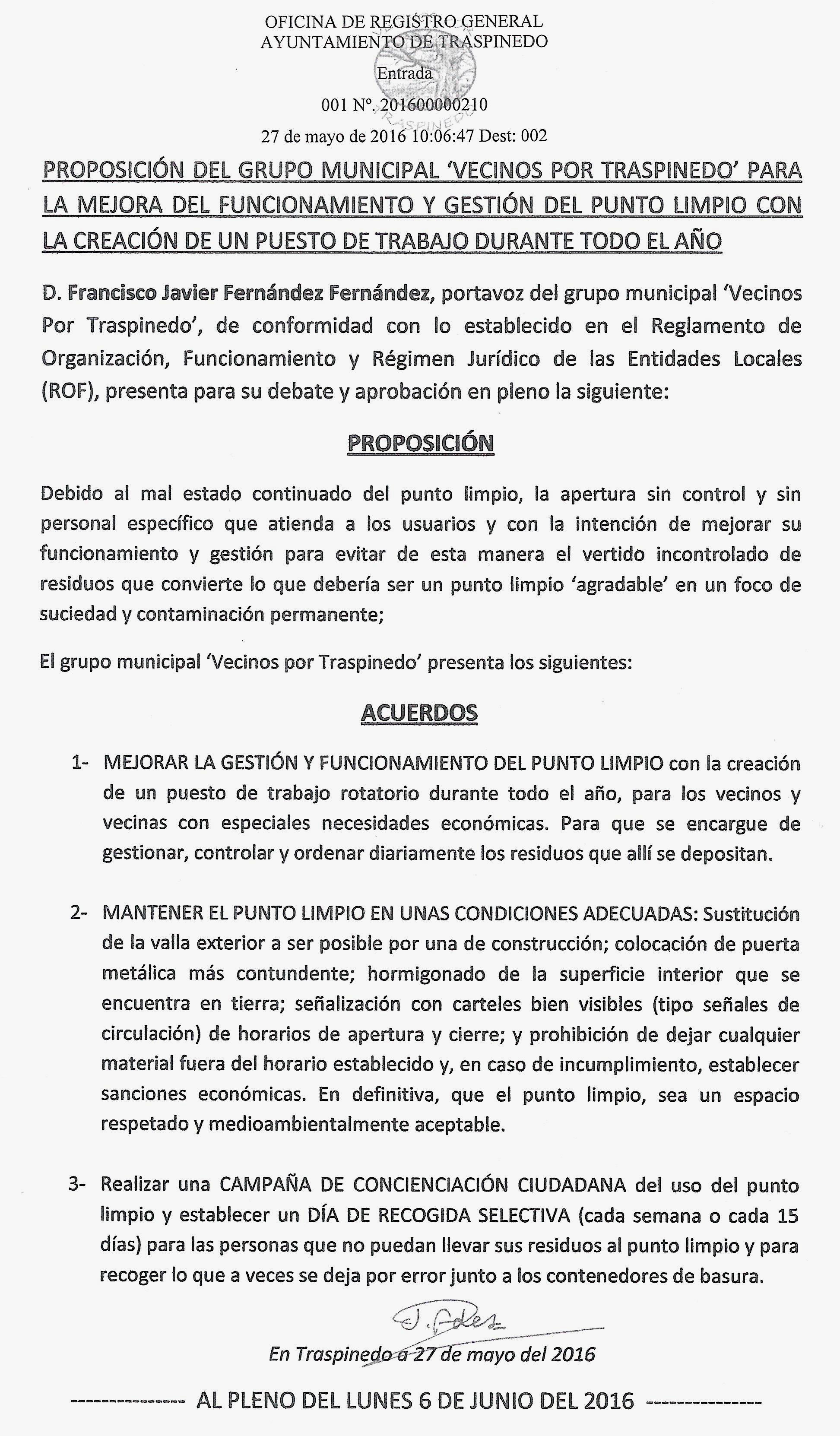 PROPOSICIÓN DEL GRUPO MUNICIPAL ‘VECINOS POR TRASPINEDO’ PARA LA MEJORA DEL FUNCIONAMIENTO Y GESTIÓN DEL PUNTO LIMPIO CON LA CREACIÓN DE UN PUESTO DE TRABAJO DURANTE TODO EL AÑO