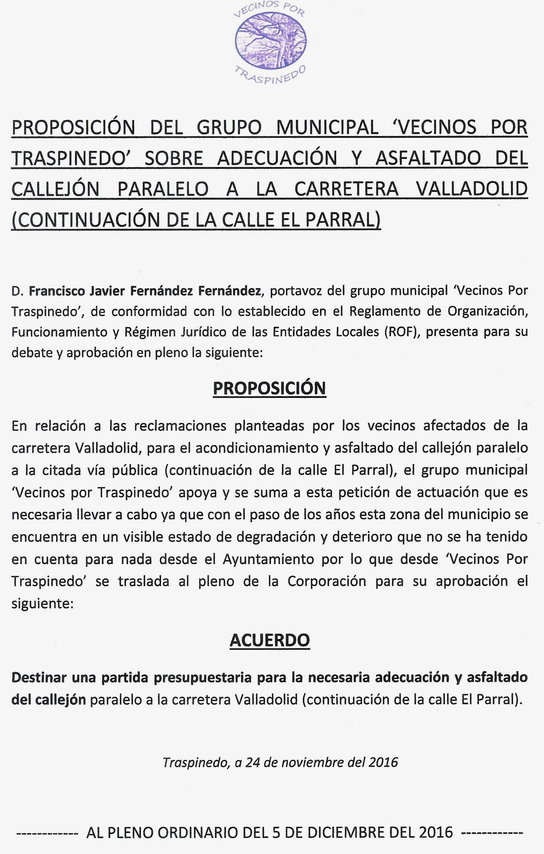 PROPOSICIÓN DEL GRUPO MUNICIPAL ‘VECINOS POR TRASPINEDO’ SOBRE ADECUACIÓN Y ASFALTADO DEL CALLEJÓN PARALELO A LA CARRETERA VALLADOLID (CONTINUACIÓN DE LA CALLE EL PARRAL)