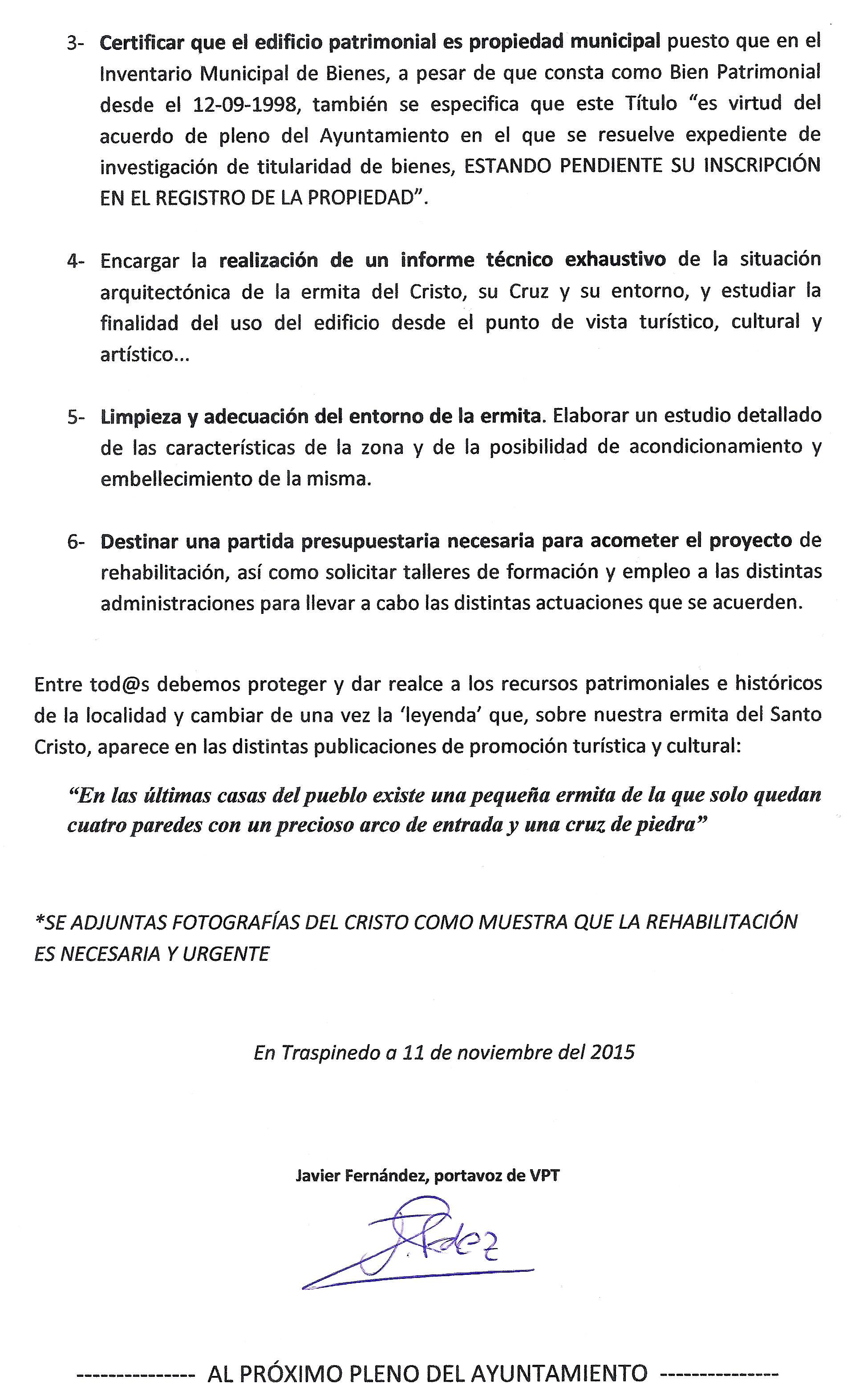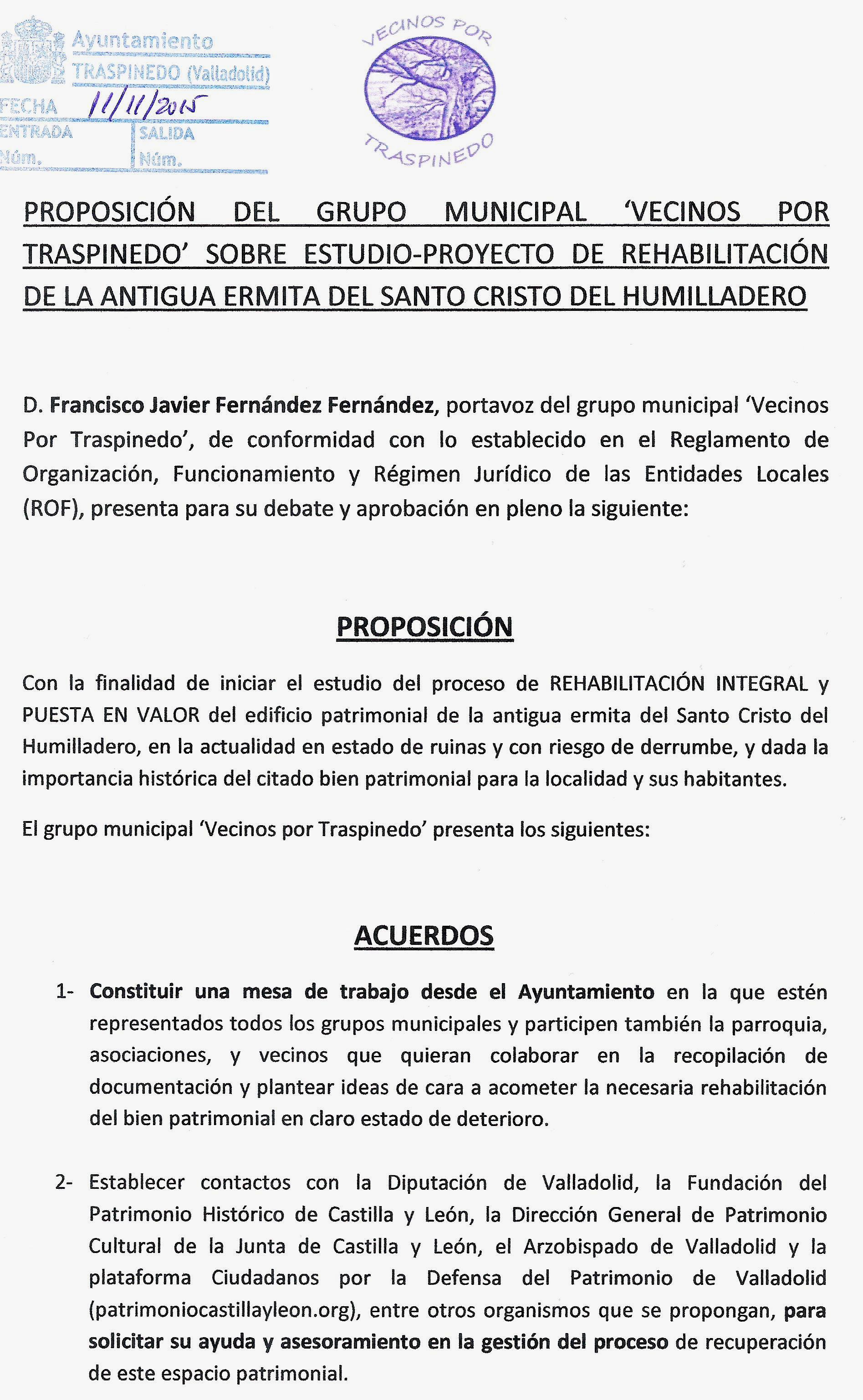 PROPOSICIÓN DEL GRUPO MUNICIPAL ‘VECINOS POR TRASPINEDO’ SOBRE ESTUDIO-PROYECTO DE REHABILITACIÓN DE LA ANTIGUA ERMITA DEL SANTO CRISTO DEL HUMILLADERO diciembre 14, 2015 | No hay comentarios PROPUESTA RECHAZADA POR EL EQUIPO DE GOBIERNO. Año 2015