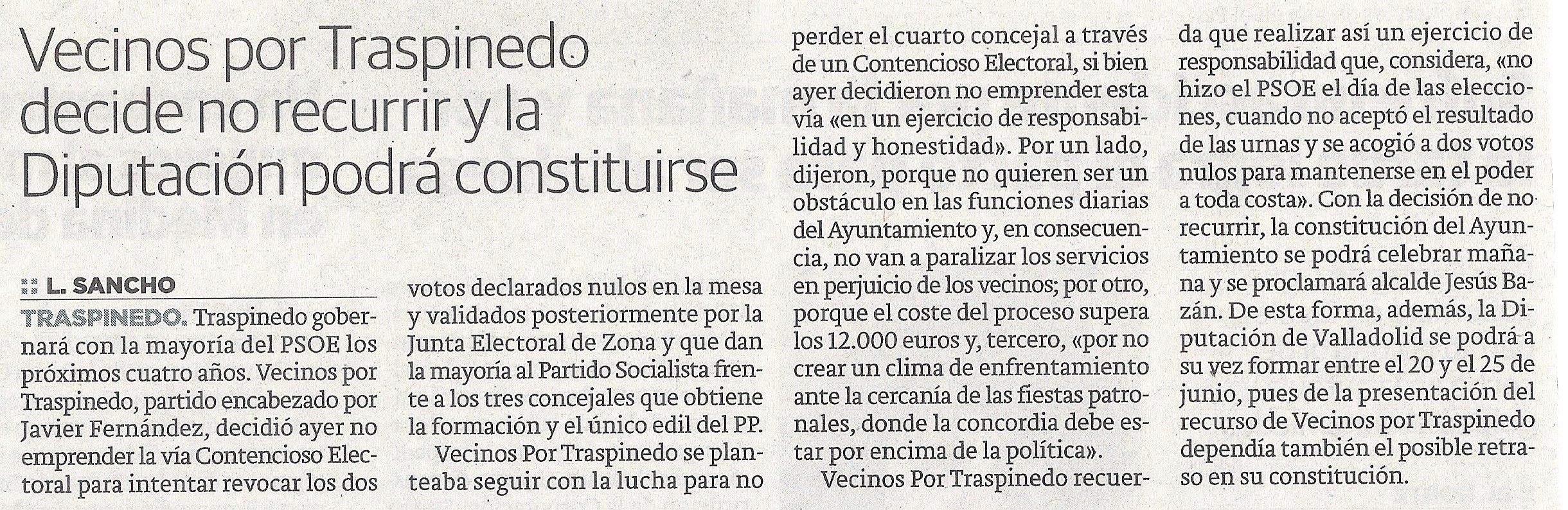 Vecinos Por Traspinedo decide no recurrir y la Diputación podrá constituirse (El Norte de Castilla) junio 12, 2015 | No hay comentarios VPT en los medios